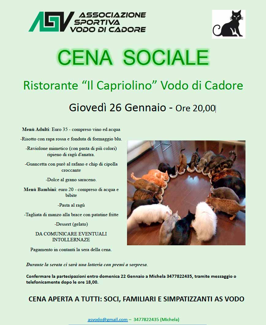 Ristorante “il Capriolino” Vodo di Cadore Venerdì 10 Gennaio 2020 – Ore 20,00 -Aperta a tutti: Soci, Famigliari, Simpatizzanti -Prezzo a persona 35,00 € -E’ richiesta la prenotazione entro mercoledì 8 Gennaio -Per contatti: asvodo@gmail.com –338 177 5198 (Manuela)