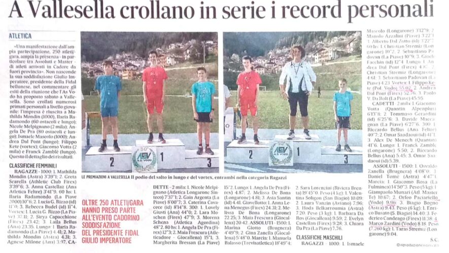 Dalle pagine sportive del Gazzettino di BL buon risalto alla manifestazione organizzata dall’AS Vodo sulla pista di Vallesella a Domegge. In evidenza i podi dei nostri atleti, su tutti Filippo Kete, primo nel vortex Ragazzi con la misura di 55,02 m.! Gli altri partecipanti con la maglia dell’AS Vodo sono Elisabetta Zardini, Elia Paciariello, Brian […]