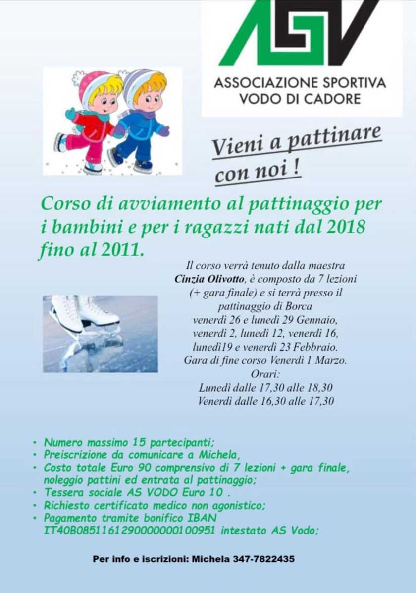 • Costo totale Euro 90 comprensivo di 7 lezioni + gara finale, noleggio pattini ed entrata al pattinaggio;